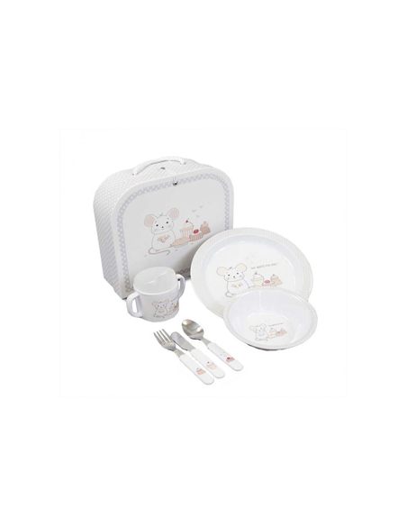 Vajilla Bebé Mon Chéri. Coqueta y simpática vajilla con motivos infantiles de color blanco con detalles en gris. Presentada en un original y práctico maletín a juego. La vajilla para bebé dispone de: